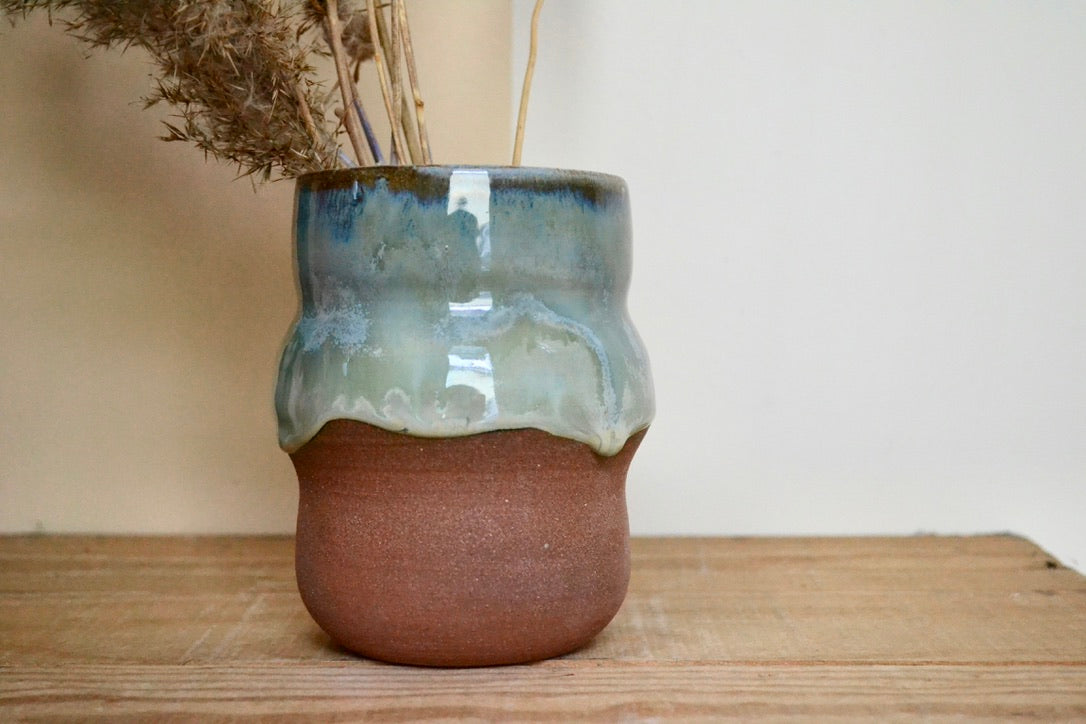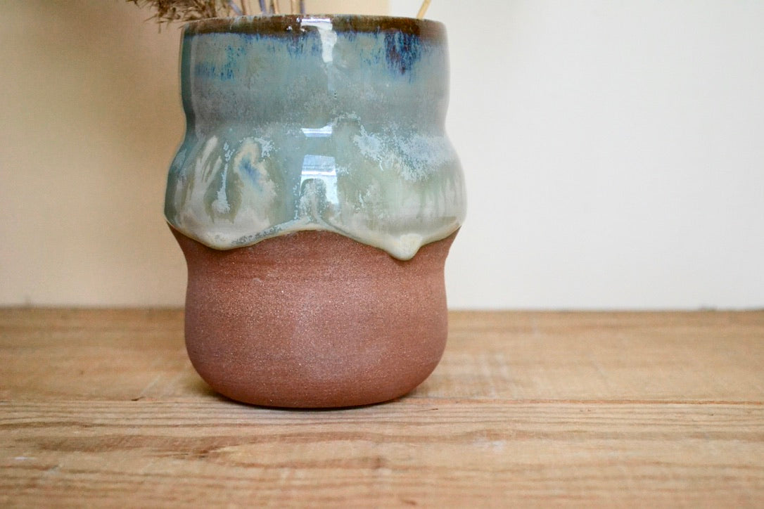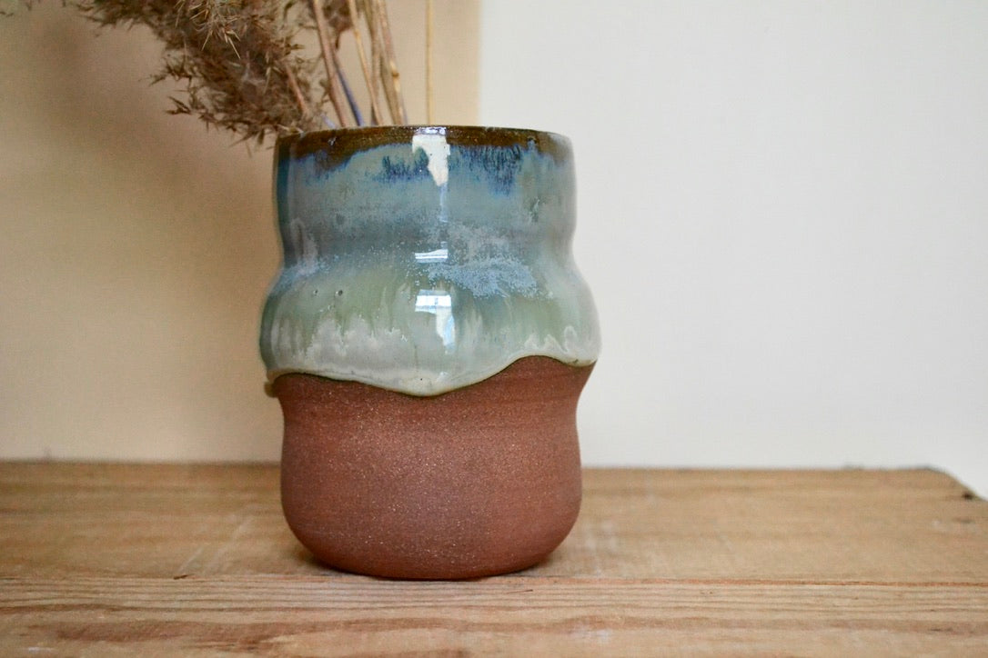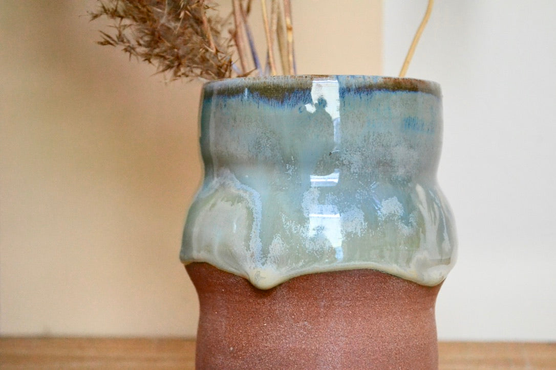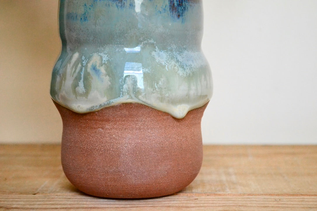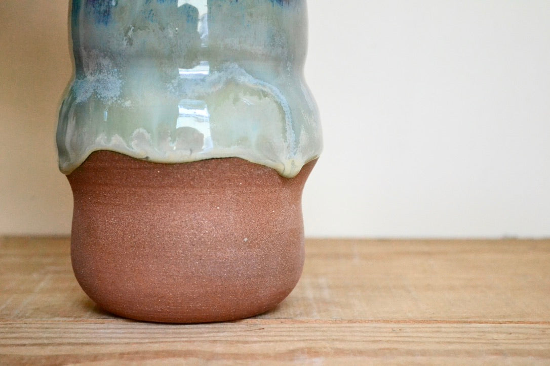 Crafted from brown stoneware and finished with vivid hues of blues that flow down the piece, making each one unique.